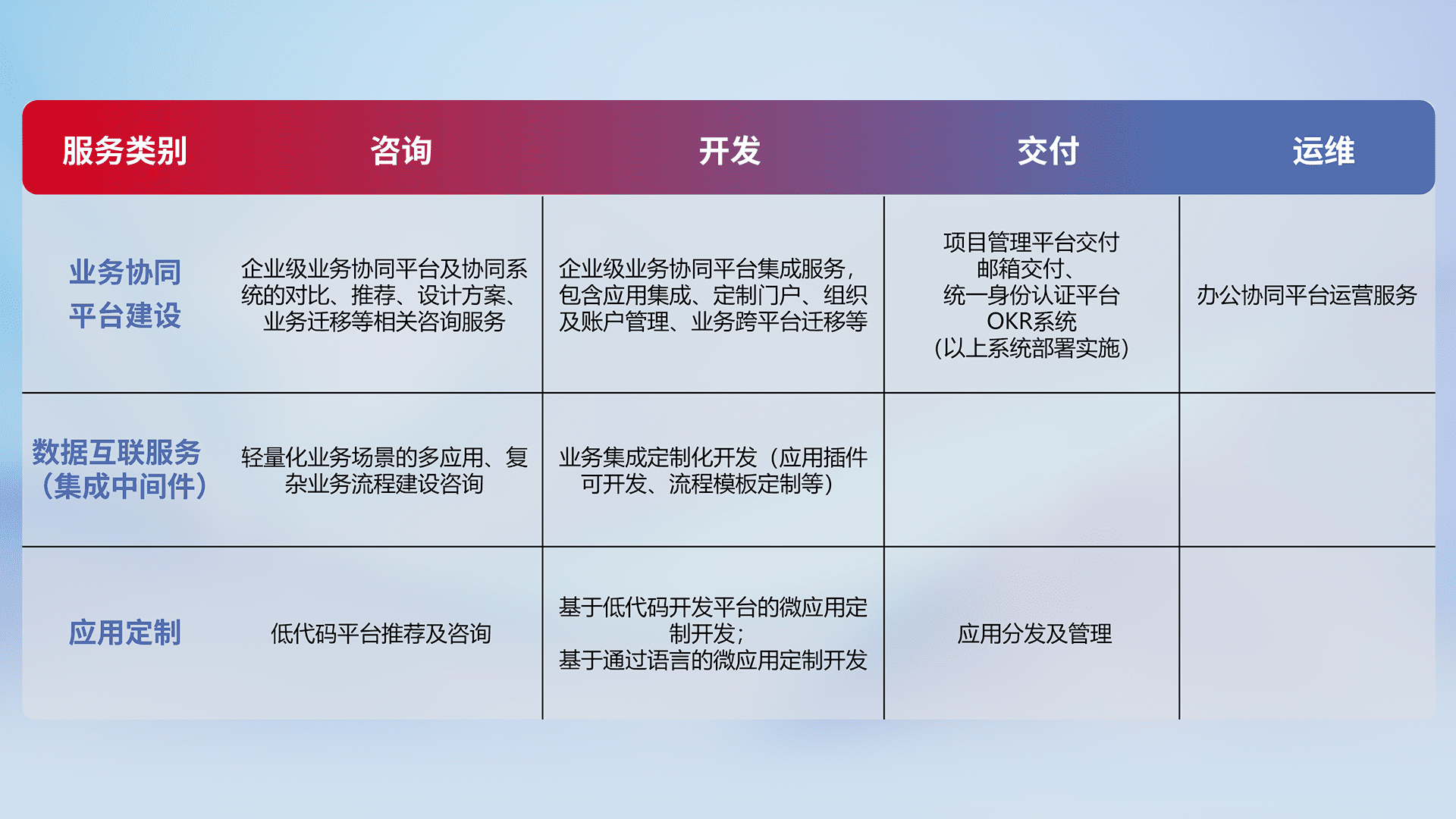 针对钉钉、、企微、、IDaas等平台级产品提供产品的规划、、方案、、交付、、、定制化开发等服务,,,实现如统一协同办公、、、智能客户服务、、混合会议管理、、、智能数据查询、、、等业务场景,,,实现数字化转型。。